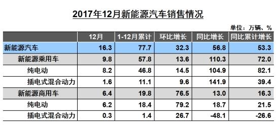 新能源汽车12月生产14.9万辆,1-12月累计生产79.4万辆,环比增长17.9%,同比增长68.5%,同比累计增长53.8%。12月,新能源汽车销售16.3万辆,1-12月累计销售77.7万辆。环比增长32.3%,同比增长56.8%,同比累计增长53.3%。