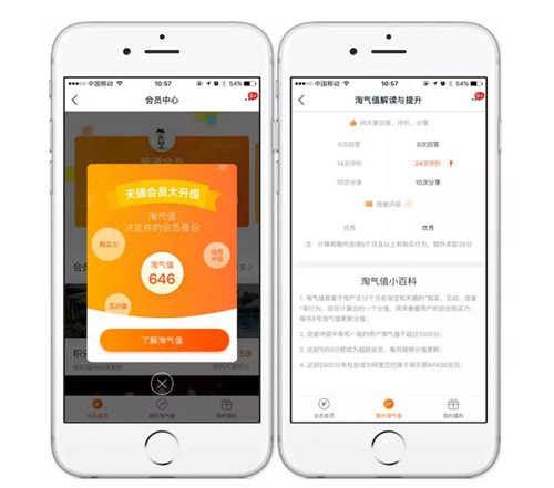 在 6 月 10 日下午的发布会上,阿里巴巴宣布,将用“淘气值”作为天猫和淘宝上用户的会员等级标准。现在最新版的天猫和淘宝 app 里,已经都使用了“淘气值”作为会员体系。两个电商 app 实际做调整是在今年 5 月 8 日。
