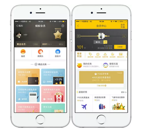 除去天猫和淘宝在使用的“淘气值”外,阿里旅行业务飞猪使用的是单独的 F 会员体系,主要就是需要用户买更多的机票,以里程计算。去年 4 月份,支付宝也上线了自己的蚂蚁会员,根据用户用支付宝的活跃度,例如打车、买电影票或者是充值、理财,都可以获得积分。此外,阿里巴巴的二手社区电商闲鱼虽然没有会员体系,但接入了芝麻信用。