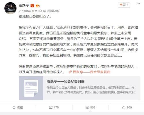 乐视至今日之巨大挑战,我会承担全部的责任,会对乐视的员工、用户、客户和投资者尽责到底。我仍旧是乐视控股的执行董事和最大股东,辞去上市公司CEO、甚至更多其他重要职务,就是为了全力以赴实现FF 91最快量产上市。乐视依然会把最好的产品奉献给大家,而乐视汽车更会按照既定的战略展开。再大的挤兑,也挤不垮我们变革汽车产业的梦想。恳请大家给乐视一些时间,给乐视汽车一些时间,我们会把金融机构、供应商以及任何的欠款全部还上。