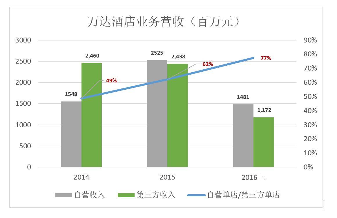 截至2016年6月末,万达旗下已开业酒店达79家,平均每家有客房310套。其中,49家自营酒店收入14.8亿,超过国际品牌(第三方)运营的30家。自营酒店单店营收也从不及第三方的一半提高到77.4%。