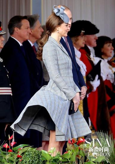 2014年,在宣布怀上夏洛特小公主后的首次公开亮相,凯特陪同威廉一起在伦敦迎接到访的新加坡总统及夫人时,凯特一身优雅精致的Alexander McQueen格纹大衣裙也飞了起来。