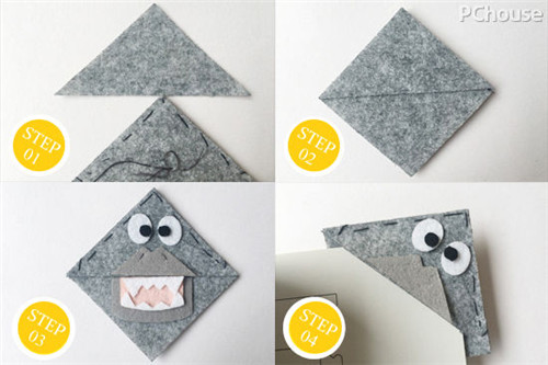 7、因为后面的缝纫线比较杂乱,需要用双面胶把灰色的三角形贴于杂乱的线上。这样可爱的书签夹就大功告成。