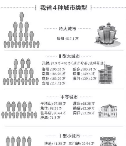 根据国务院对原有城市规模调整标准,河南如下——特大城市:郑州。Ⅱ型大城市:开封、洛阳、新乡、南阳、信阳、商丘、漯河、安阳。中等城市:平顶山、濮阳、焦作、鹤壁、驻马店、周口、济源。Ⅰ型小城市:许昌、三门峡。