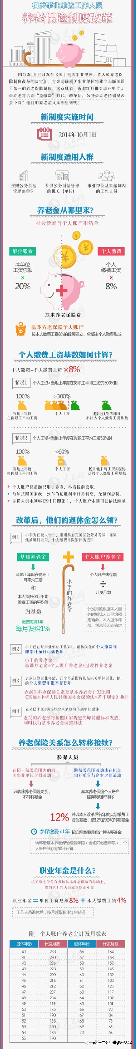 近日,国务院印发《关于机关事业单位工作人员养老保险制度改革的决定》,决定从2014年10月1日起对机关事业单位工作人员养老保险制度进行改革,涉及全国所有按公务员法管理的单位、参照公务员法管理的机关(单位)、事业单位及其编制内人员,全国近4000万体制内人员、我省300万体制人将从吃财政饭转变为缴养老金,从单位养老转向社会化养老。赶紧来看看怎么并轨的吧!