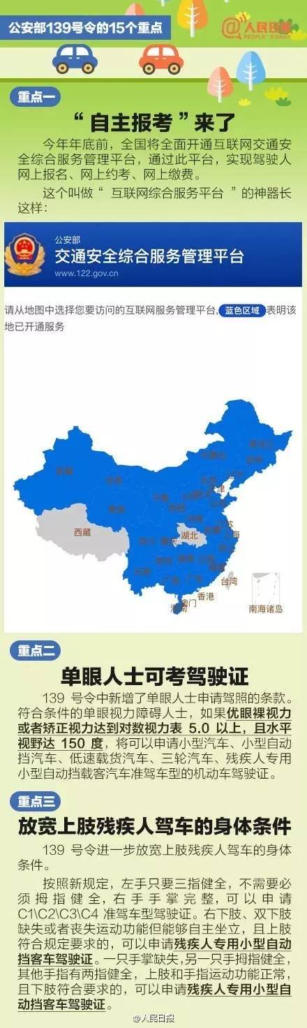 4月1日起,公安部《机动车驾驶证申领和使用规定》将正式实施。今后,驾驶人考试可以网上自主预约,驾驶证在全国可以异地年审,每年提交驾驶证身体条件证明的年龄由60周岁改为70周岁……