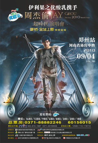 由河南交通广播主办的“2010周杰伦超时代郑州演唱会”将于今年9月4号在河南省体育中心隆重举行,演唱会上,周杰伦将以“春、夏、秋、冬”为主题演唱10年来的经典音乐作品,并将舞蹈、魔术表演融入其中,继续玩他别出心裁的杰式花样。全新的音乐主题,全新的鬼马造型,全新的炫耀舞台,精彩程度更胜以往,向歌迷展现一场史无前例的视听盛宴。
