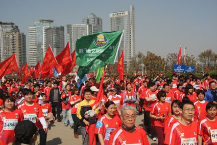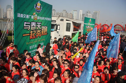 3月27上午,绿城郑州阳光明媚,春意盎然,2011年中国郑开国际马拉松赛分别在郑州市郑开大道和郑东新区商务内环鸣枪举行,来自28个国家和地区的近3万名选手参加了比赛。河南交通广播也组织了由1041名车友组成的“千人跑友团”参赛,大家一起跑进春天,共同庆祝交通广播成立18周年。