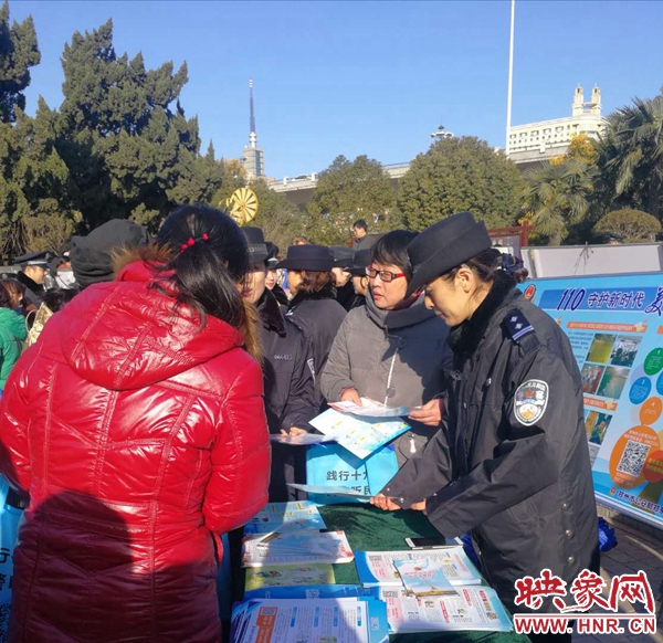 1月10日,全国第32个110宣传日,郑州市公安局开通110报警服务22周年,郑州市公安局结合“践行十九大,民警听民声”主题活动,在紫荆山广场开展了“110,守护新时代美好生活”走近群众大型宣传活动。公安民警、辅警、消防官兵、巡防队员、保安队员、社会各界群众参加活动。活动现场,各分局、单位民警现场向广大市民普及法律法规,宣传110报警常识,引导群众更加支持110工作,更好利用110为市民服务,现场发放法律法规宣传手册,向市民展示现代化武器警戒设备。