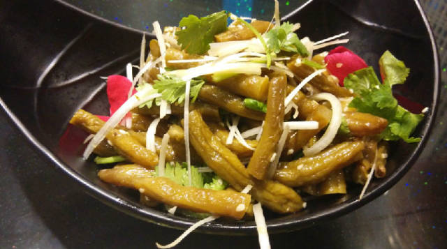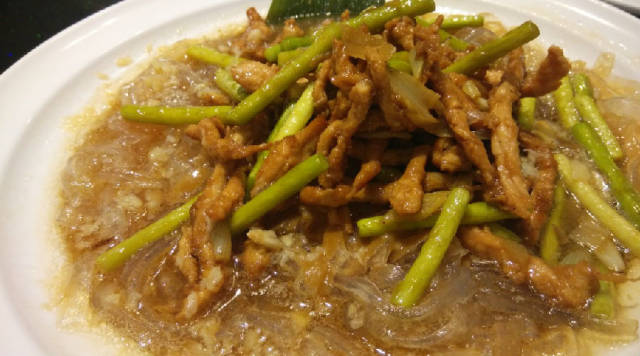 想知道一家店里豫菜做的中不中,试两道菜就够了,炒豆芽和肉丝带底,好的炒肉丝既能把肉的鲜香味道完全体现出来,还能炒的很爽嫩,爽嫩中要有点肌肉纤维的弹牙感,在咀嚼的过程中你会感受到厨师技艺的精湛!吃几口肉丝后,你再把剩下的肉丝和垫底的粉皮拌匀,然后大口的吃,所有炒肉丝的汤汁全部被温拌的粉皮吸收了,肉香、菜香加上粉皮的筋软,还有点蒜泥的味道融合的是那么的恰到好处,你会不自觉的风扫残云,把这一盘美味来个底朝天。