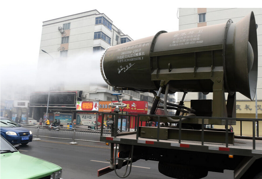 郑州街头现“防霾神器”雾炮车,据悉其喷射的水雾颗粒达到微米级,能有效分解空气中的污染颗粒物、尘埃等,有效缓解雾霾。2015年01月05日,河南省郑州市经三路上出现一辆大卡车,车上拉着一个大炮筒。工作人员说,这是一辆多功能抑尘车,俗称“雾炮车”。“这辆车能装10吨水,供雾炮喷射75分钟。”工程师张国强说,雾炮车喷射的水雾颗粒达到微米级,能有效分解空气中的污染颗粒物、尘埃等,有效缓解雾霾。