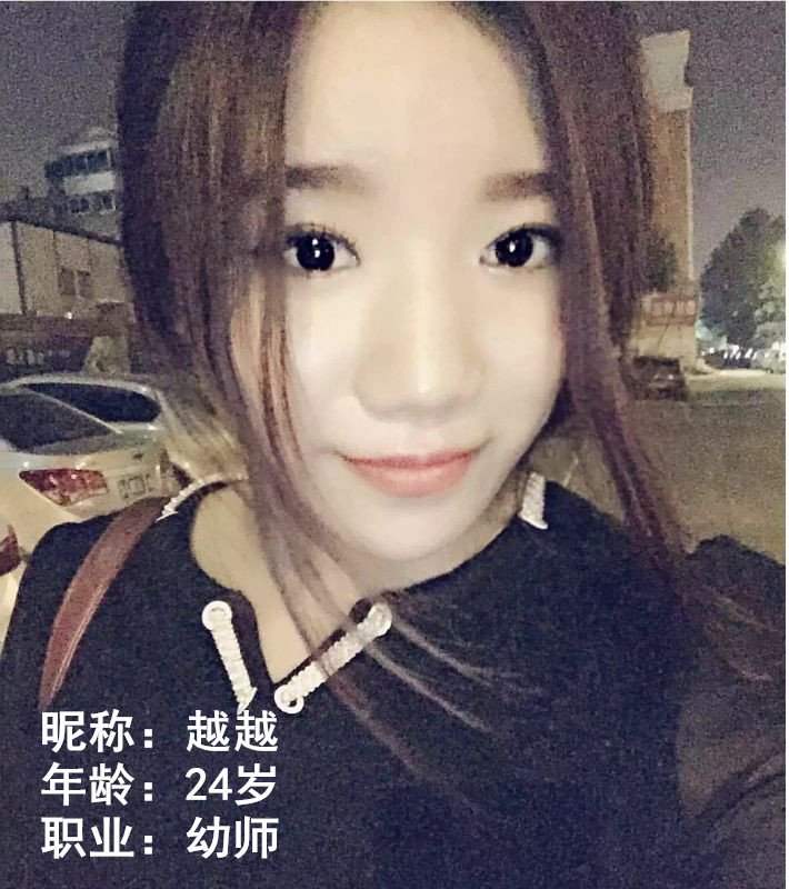 大家好,我是越越,今年24岁,郑州土著,幼师一枚,我是一个特别逗的人,不管是谁或者在哪,我都能让气氛变得超级融洽,大大咧咧一个人,心直口快。我有两段感情经历,因为很多原因最后分开了。我希望我的另一半可以跟我聊的来,有共同的兴趣爱好,年龄大些是最好的,身高样貌其实没什么特别的标准,我觉得感觉是最重要的,我希望今天,可以遇到对的那个你。