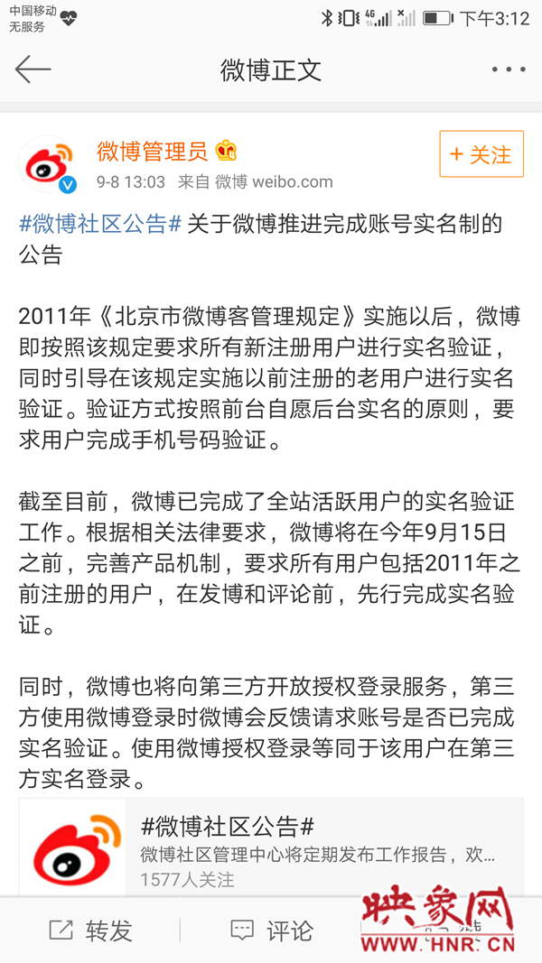 映象网快讯(记者 阮海峰 文/图)9月8日下午新浪微博官方发布消息称,9月15日之前包含2011年之前注册的所有用户均需要完成微博实名认证,否则无法发送新微博以及评论。