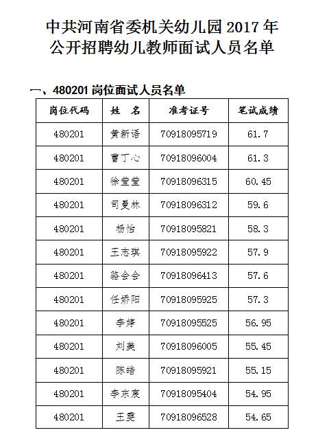 附件:中共河南省委机关幼儿园2017年公开招聘幼儿教师面试人员名单