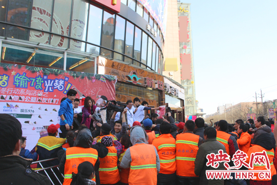 位于紫荆山路上的新世界百货,是本次活动的终点站,当奔跑队伍到达时,那里早已聚集了参与976暖冬行动接受物品捐助的数百名环卫工们,当他们接过主办方送来的平安果和物品时,个个激动不已。