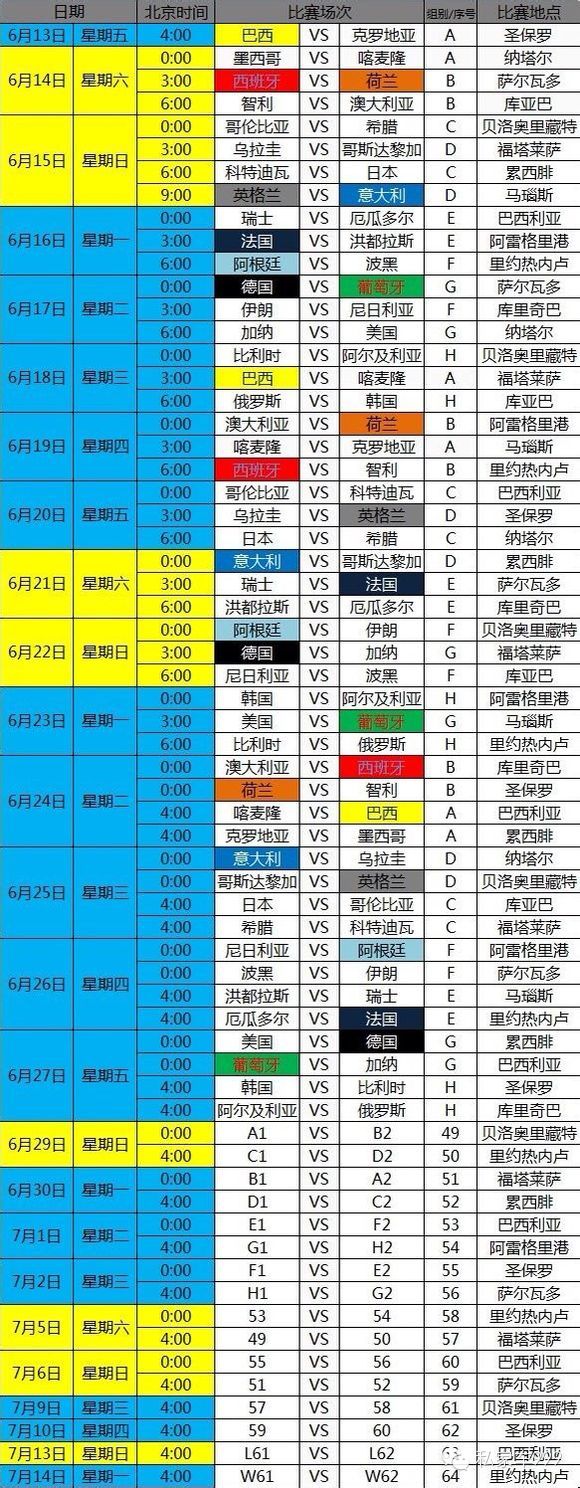 下面将巴西世界杯的所有比赛赛程示列如下,送给各位球迷天使: