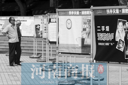 在昨天郑州市绿城广场上举办的世界无烟日宣传活动上,相关控烟人士表示,我国是全球最大的烟草生产国、消费国,同时也是最大的烟草受害国,目前除了特定公共场合等禁止抽烟外,“平装烟包”的推广也将是一个迅速有效的手段。
