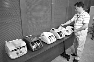 昨日,央行工作人员用各种验钞机对C1F9假币进行测试,机器均能及时作出异常报警反应。新京报记者 浦峰/摄
