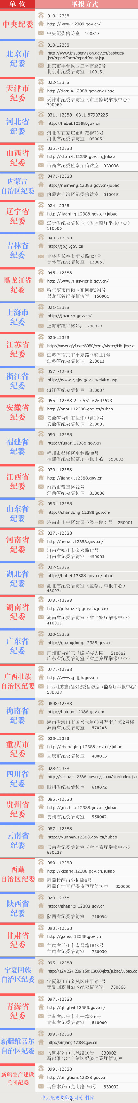 附:中纪委公布各地纪委联系方式