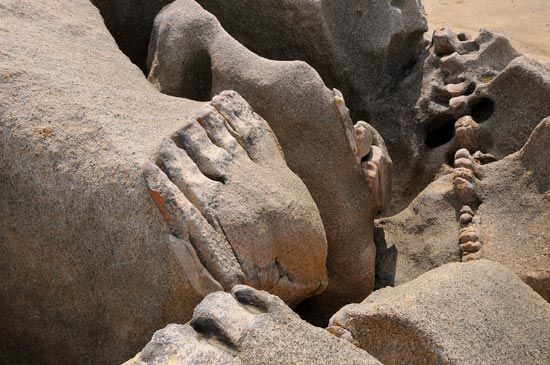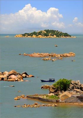 走进那琴墟,远远就可以看见一块椭圆形巨石立在海湾的石山上,“浪琴湾”三个隽秀的大字刻在上面,巨石中间裂开一道笔直的石缝,像巨斧劈开,这就是传说的试剑石。三十公里的海岸和石山上处处巨石堆叠,有名的象形石就有试剑石、龙船石、企人石、熊掌石、海豚石、鸳鸯石、美女头像石、仙人足印石、将军靴石等等;搁在山顶上的风动石就有七、八处,还有一块奇特的出水石。远观群山之石,似漫山遍野的绵羊;那壁立千仞的巨石又似森严的城堡,石面上遗留的斑斑水迹又似写在半山的大型壁画。山上巨石凝望着海湾,海湾的浪花亲吻着巨石;巨石经历万年雕琢,天成神迹。奇石最集中的浪琴湾、下塘湾,海滩的群石,一直伸延出海,似万头下海的大象,又似千帆竞发的渔船;在海中还有几处大石堆,似山似岛,海潮拍打,白浪飞溅,……海风卷帘的舞姿绝非蓄意,流荡的造型撩起你的思绪,面对这里块块巨石,这玄幻神秘的自然力量,让你充盈着无尽的遐想。只要置身其中,你会浸沉在不断的灵感之中,以艺术为她记录,用雕塑赋以她生命,把自己的激情、斗志、向往和洒脱随石托起,让彷徨、无奈、烦恼和孤独随浪而去。