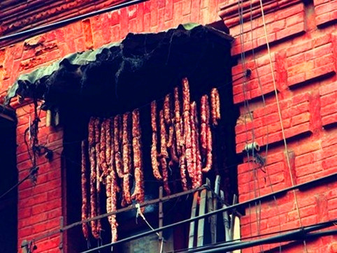在桂林,桂林人尤其喜欢把腌制腊肉作为春节迎客送礼的美食。每年秋冬时期,正是桂林人腌制腊肉的好时机。这时候,你只需要到桂林老市民家中或小区走走,在屋檐下、窗台前,阳台下,甚至晾衣服的绳子上都能看到一串串令人垂涎三尺的腊肉,常常形成这一带的腊肉肉林,引来路人或者经过的小动物的伫立,但是站在下面的我们,只能眼巴巴的望“肉”止渴。看看下面这些图。