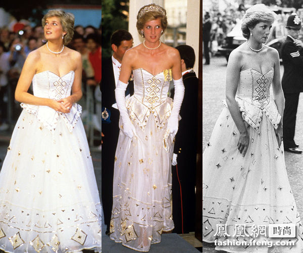 据悉,该款礼服正是出自王妃曾经的婚纱设计者伊曼纽尔夫妇(David&Elizabeth Emanuel)之手。该礼服在1986年时被推出,是一条饰满了金片、水晶和珠串的精美华服。由于王妃曾在较短时间内三次穿着该礼服出席公众场合,因此世人皆认定这是王妃最钟爱的服装。