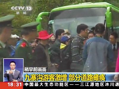 2日中午,四川九寨沟景区发生游客滞留事件。 央视截图