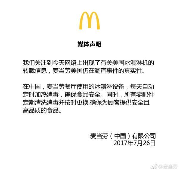 7月26日23时许,麦当劳官方微博发布了《关于美国冰淇淋机的媒体声明》:“我们关注到今天网络上出现了有关美国冰淇淋机的转载信息,麦当劳美国仍在调查事件的真实性。在中国,麦当劳餐厅使用的冰淇淋设备,每天自动定时加热消毒,确保食品安全。同时,所有零配件定期清洗消毒并按时更换,确保为顾客提供安全且高品质的食品。”