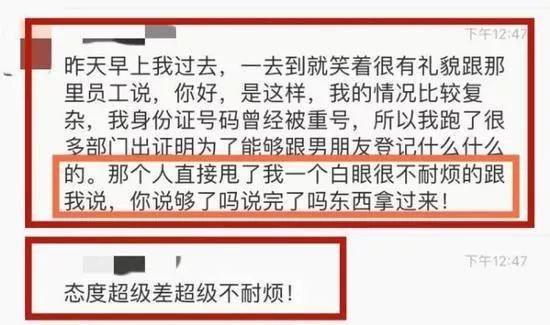 当天妹子一大早和男友去民政局登记结婚,这个妹子的情况有些特殊,因为她的身份证号码曾经重过号,所以就跑了很多部门出证明,就为了能够顺利登记。但工作人员的态度实在让人懵逼:直接甩了妹子一个白眼,还超级不耐烦!