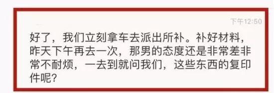 于是,妹子和男友按照这位男性工作人员的要求去派出所补材料,到了下午,两人又跑了一趟,该工作人员又问:“这些东西的复印件呢?”