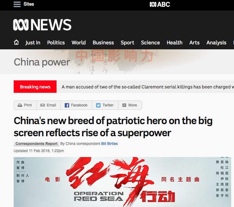 澳大利亚广播公司新闻网分析称,中国大银幕上的新型爱国英雄反映了一个超级大国的崛起。作为中国强大外交自信在电影领域的展现,银幕英雄将会越来越多的挥舞着中国旗帜。