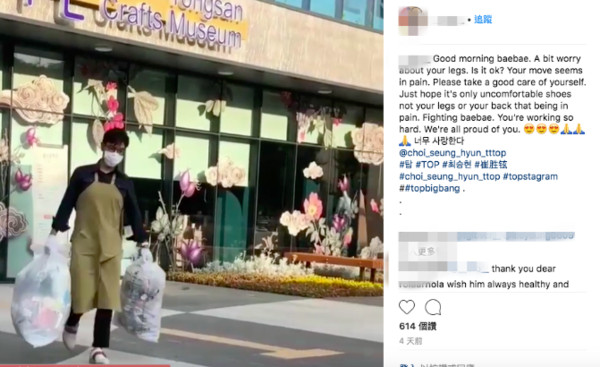 T.O.P近日一连被曝光各种不同的当兵照,他似乎是负责倒垃圾的工作,每天都会拿出大袋垃圾外出整理,偶尔用车子运、偶尔围着围裙手提垃圾,拍摄这段下班路的粉丝,几乎天天都会PO出近况照,该名粉丝还会附上心得“有点担心你的脚,还好吗?”、“你今天看起来(气色)很好”。