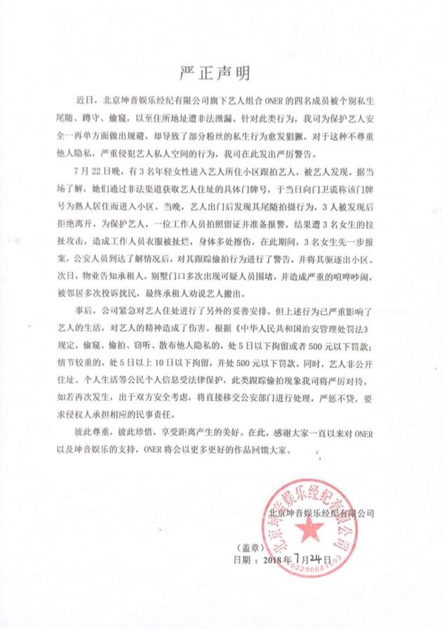 7月25日凌晨,坤音娱乐发表声明,称旗下组合ONER的四名成员近日被个别私生饭尾随、蹲守、偷窥,以至住所地址遭非法泄露。并表示如若再次发生此类跟踪偷拍现象,将直接移交公安部门进行处理,并要求侵权人承认相应的民事责任。
