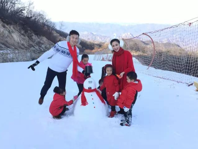 冬天里的春节,怎么能没有雪?李伦、赵靓和孩子堆雪人。