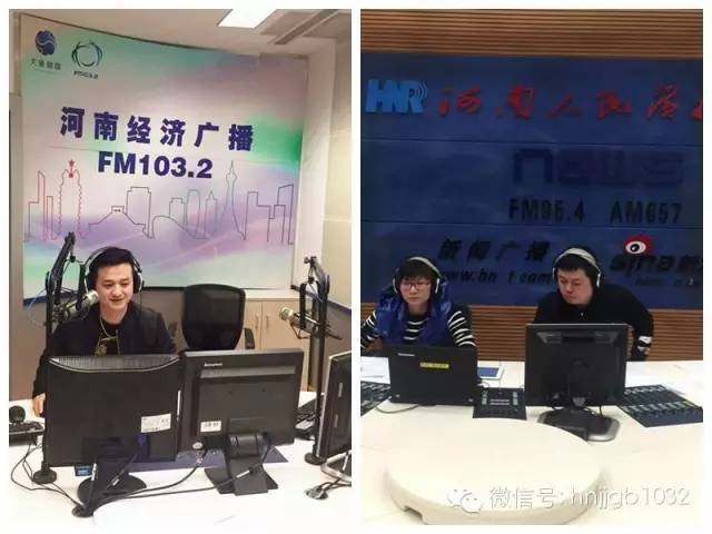 本部直播室中,河南经济广播主持人苏鹏(左一)和河南新闻广播主持人赵蕾(右二)、私家车999主持人莫非(右一)正在并机直播。