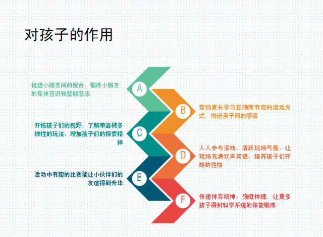 “趣味亲子运动趴”根据孩子年龄不同设置指标,由家长和孩子共同参与、相互协作完成,是一次从耐力到动手能力、反应力到创造力,速度与平衡全面考量的一系列亲子活动,从“欢乐亲子跑”到“趣味体能大冲关”,不但提高幼儿的活动技能,开拓孩子们的视野,增加孩子们的探索精神,增强少年儿童的身体素质的,又寓教于乐,有利于孩子们身心健康成长,同时让家长们也了解正确而有趣的运动方式,更好的增进父母与孩子间感情。