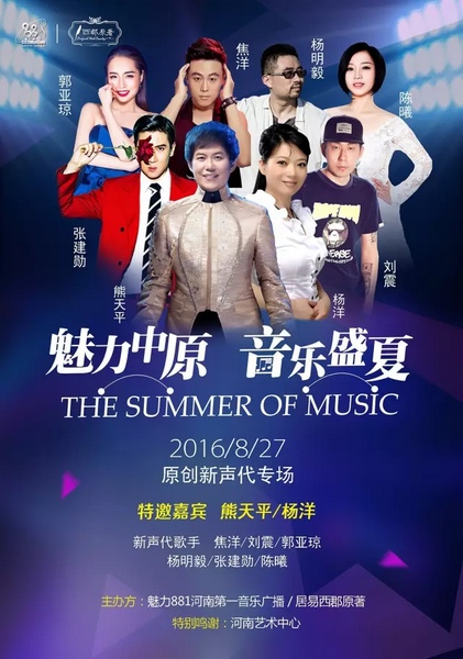 2016年8月27日晚7:30,台湾歌手熊天平、杨洋助阵“魅力中原·音乐盛夏”大型广场消夏音乐季第四场:《原创新声带》!与中原原创音乐人一起,唱响如意湖畔!