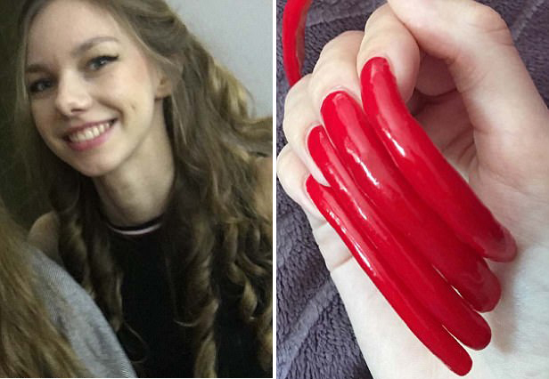 据英国《每日邮报》4月4日报道,德国16岁的学生西蒙·泰勒(Simon Taylor)上次剪指甲已经是2014年的事了,2015年5月她在照片分享软件Instagram上分享了她指甲的照片,俘获了很多粉丝。现在她的指甲已经有6英寸(约15.2厘米)长,可是最近考试时没法握住钢笔让她很痛苦。