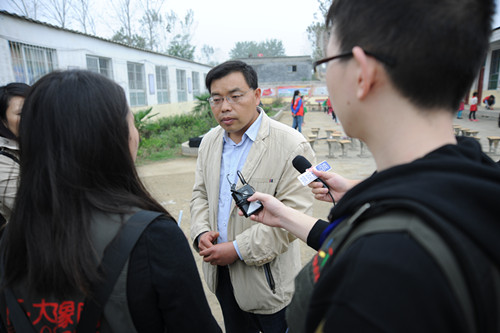 河南贾小校校长郭永强(右)为省体彩中心赠送锦旗