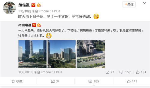 见过大世面的胡总为什么把郑州比作洛杉矶呢?这应该不仅仅只是郑州的蓝天,而是这个城市在不断地发展、充满活力。胡总说每一次来 都给他不一样的感觉。目前正在郑州参与“文化郑州名人行”的《环球时报》总编辑胡锡进先生,他的两个微博“一大早起来,洛杉矶的天气好极了。下楼喝了碗胡辣汤,才缓过神来,哦,我是在河南郑州,过几天才去洛杉矶。”、“昨天(22日)雨下到半夜,早上一出宾馆,空气好香甜”更是火遍了朋友圈。短短时间内竟然引来了上百条评论,各路网友纷纷为他为郑州的“点赞”而点赞!