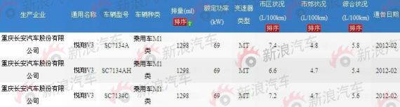 在工信部的新车油耗信息上,标明“悦翔V3”的三款新车已经上榜,车型代号分别是长安 SC7134A、SC7134AH和SC7134C。这三款车型均是1.3L排量,分别是代号JL474QAF和JL474QD的两款机型,排量均为1298ml,最大功率均是69kw,再加上不同配置车型的整备质量会有差异,因此三款车型在油耗的表现上都略有不同。不过全系配置的五速手动变速箱,以及整体没有超过1000kg的整备质量,注定其油耗水平不会太高。