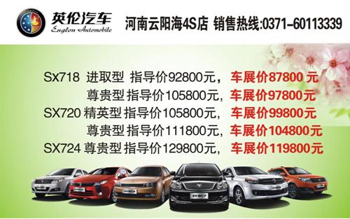 2013年4月11日,大河车展于郑州国际会展中心正式开幕,河南云阳海英伦4S店值此佳际特别推出钜惠,同时,吉利厂家为支持此次英伦SX7上市活动特提供100台英伦SX7,零利润售车,时间仅限大河车展期间购车,只剩三天,8.78万起,11号当天就实现20来台的好成绩,时间有限,购车的朋友们请赶快拨打我们热线15138454051报名吧,或者直接到车展现场购车,机会只此一次,不容错过啊!
