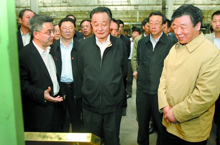 4月15日,中共中央政治局常委、全国人大常委会委员长吴邦国在风神轮胎股份有限公司高性能乘用车轮胎及工程子午胎项目生产车间考察工作。 河南日报记者 郭 宇 李建峰 摄