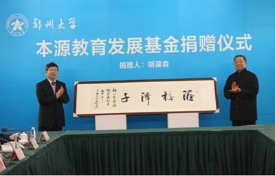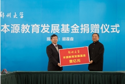 2016年12月23日,郑州大学1976级校友、建业集团董事长胡葆森向母校捐款一亿元,设立“本源教育发展基金”,力推郑州大学打造成世界一流大学和一流学科的“双一流”大学。此次捐款开创了河南省高校校友大额捐赠先河,足以载入河南教育发展史册。