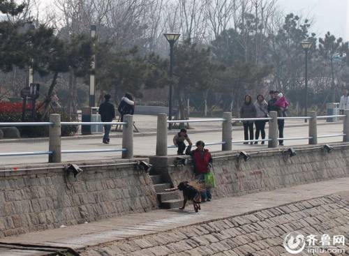 青岛栈桥现“环保狗” 不畏寒冷跳海捡垃圾