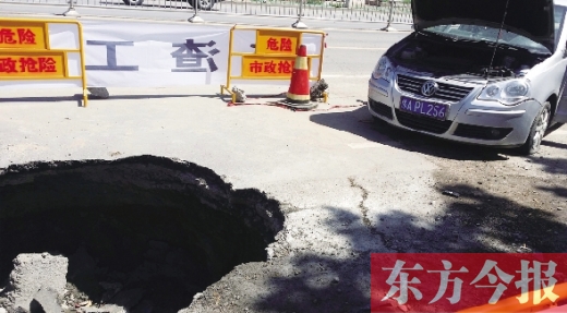 为了寻找责任方,一根筋的高先生,就将车停在坑边,并在坑周围扯起横幅,和几个朋友三班倒守在坑边。“因为他们(市政处)也有人守在这儿,一看到我们不在,就试图回填这个坑。”高先生介绍,5月9日夜里近12点时,市政处工作人员就曾趁空当回填沙土。“像是要掩饰什么。”高先生认为,找不到责任方,又不知塌陷原因,就随便把坑填住,只会留下无尽隐患。
