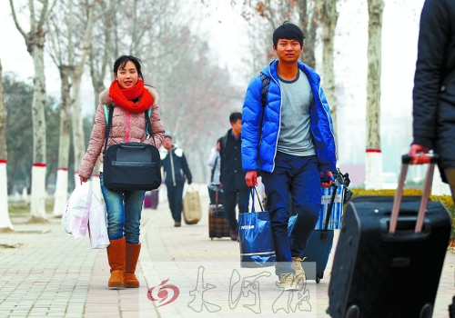 今天是我省多数中小学寒假开学第一天。经过一个春节长假,对许多住校的学生来说,开学既是新学期的开始,更意味着与父母的再次长时间别离。郑州大学、河南财经政法大学等高校这两天也打开校门,迎接前来返校报到的学子们。昨天,在郑州部分小学门口,很多家长在送子女报到后在校门口一站大半天,等着放学一同离开。而在大学“陪送团”中,鲜见家长的身影,记者昨日在郑大校园内拍摄四个小时,仅见到两名家长相送。而大学生们的行囊中,大包小裹的少了,拖着拉杆箱的占了大多数。 (记者 王灿 实习生 姜天骐 文 记者 白周峰 摄影)