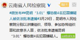 中新网3月29日电 据云南省人民检察院官方微博消息,3月29日,昆明市人民检察院分别以涉嫌组织、领导、参加恐怖组织罪和故意杀人罪,依法批准逮捕昆明“3.01”爆恐案4名犯罪嫌疑人。