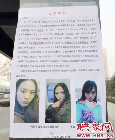 2014年12月5日,郑州花园路北环附近一住宅区发生一起重大入室盗窃案,嫌疑人盗窃20余万元财物后潜逃。现查明:犯罪嫌疑人张明燕,女,26岁,有兔牙,身上有明显狐臭。警方发布协查通报,悬赏万元缉拿。管你是谁,转发,帮警方追逃!