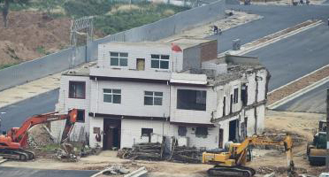 5月16日,洛阳龙门大道旁一条即将通车的道路中央,一栋3层住宅正位于两个快车道正中央,拦腰截断路的东西走向,屋顶悬挂1面国旗,屋前两辆挖掘机严正以待,等待拆挖。该房屋主人疑因不满意政府的拆迁赔付款问题,占据路中央已有2年多之久。